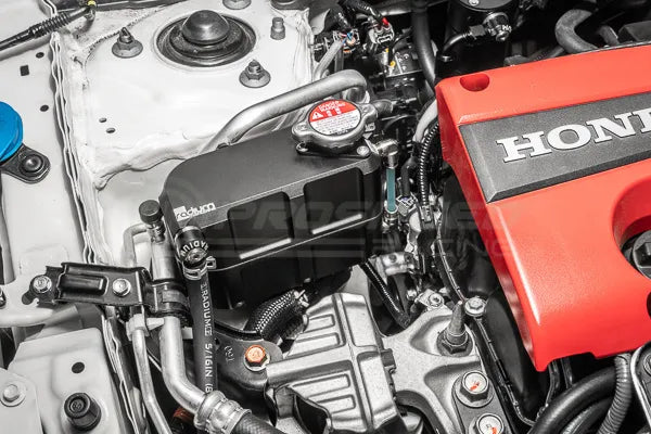 Because of continuous and intense heat cycling, plastic coolant tanks have a reputation of failing over time. Fortunately, the rugged 2-piece Radium Engineering replacement is CNC machined from aluminum and anodized for increased longevity. And because aluminum is a superior thermal conductor material, heat transfer is further improved. Additionally, the metal construction is robust enough to use in racing applications. This 2017+ Honda Civic Type-R kit directly replaces the plastic Honda tank without making permanent modifications to the vehicle. A specially designed mounting bracket secures to existing threaded holes and Radium adapter fittings interface with the factory lines. The tank functionality remains the same as the OEM cooling system. The Radium Engineering Coolant Expansion Tank has proved itself over the years in many applications all over the world, in race and street vehicles. The internal volume of the Radium Engineering Coolant Expansion Tank is equivalent to the OEM tank resulting in no coolant loss. The internal design features two chambers with cross-over passages at the top and bottom. The coolant tank also has an internal swirl feature aiding in deaerating the system. The kit includes all parts necessary for installation. NOTE: The OEM 1.3 Bar Honda pressure cap can be re-used. Alternatively, various pressure reliefs of the Radium Engineering Type-A cap can be purchased separately.