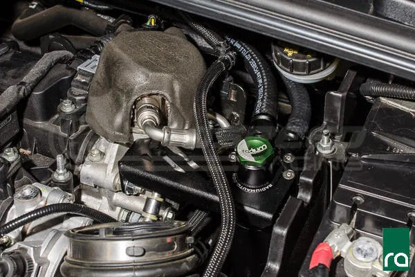 This catch can kit mounts on the back LH side of the engine bay. The Focus RS requires kit 20-0316, while the Focus ST requires kit 20-0357. This is due to different mounting bracket designs necessary because of the subtle changes between the engine bays.