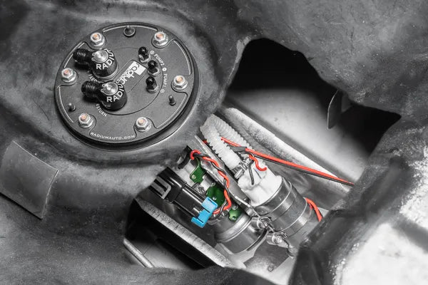 The rear pump assembly is placed in the tank first. A tool is provided to keep this pump back and away while inserting the front pump. An electrical plug and a SAE quick connector eliminate the need to perform tedious assembly before dropping the entire assembly into the tank. Both fuel pump merge into the single 8AN ORB outlet of the fuel hat. And because of the integrated check valves, fuel pump staging is permitted.