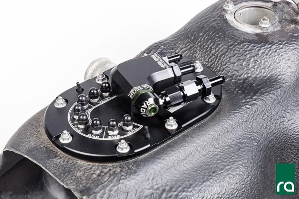 Unlike the 2001-2007 WRX STi OEM variation, the Radium Engineering collector box has been optimized to work in ALL gas tanks. Shown below is the smallest OEM gas tank baffle found in the model list above. It improves the fuel supply around the pump(s) inlet. There is a 1" check valve incorporated on the front side of the tank that serves as a trap door keeping the pump(s) supplied with fuel during aggressive driving. Furthermore, all returning fuel from the pressure regulator return and the crossover hose enter the collector box keeping it full. The OEM fuel level and fuel temperature sensors secure to the mounting bracket.