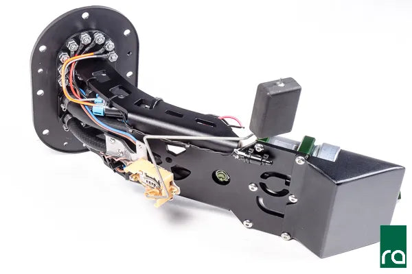 The machined assembly mounts in the factory fuel tank using the OEM gasket and hardware. The fuel level sender and temperature sensors are retained, as shown below.