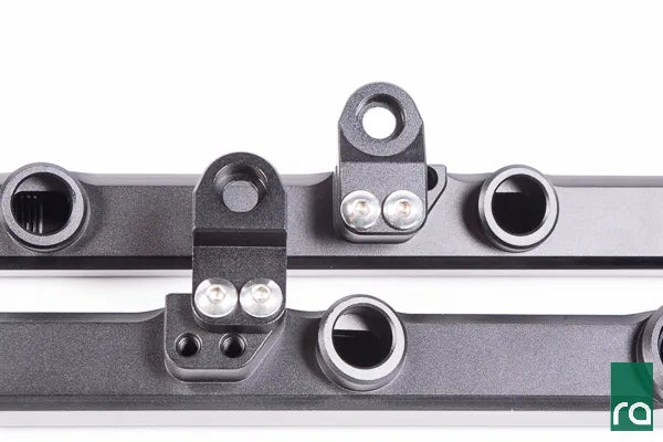 Manufactured with a large 0.69" internal bore, the fuel rails can support all necessary engine power requirements. They are CNC machined from extruded 6063 aluminum, black anodized, and laser etched for a high quality surface finish. All end ports are machined with 8AN ORB (3/4-16 female) threads. The lower center ports can be used for optional adapters and are also tapped with 8AN ORB (3/4-16 female) threads.