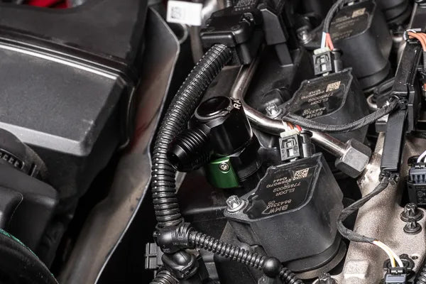 This fitting adapts the crankcase ventilation connector on many engines to 10AN male. These are primarily used for air/oil separation catch cans. This secures directly to the valve cover. Because it is 90 degree, it is perfect for 2nd generation B58TU valve covers which have a vertical port, as shown. Internal O-rings permit swiveling even after installation.