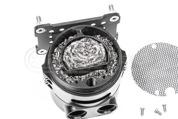 The VTA CCC features one giant non-restrictive outlet that is over 183% larger than the inner diameter of 10AN inlets. This increase in volume slows air flow allowing contaminants to fall out of suspension. Additionally, contaminants are trapped with a diffuser permitting the oil sludge to fall back into the catch can preventing overspray in the engine bay. The CNC machined aluminum can unscrews for ease of serviceability. The VTA CCC has 46.2% more stainless steel filtration media than the VTE CCC and 149.7% more than the standard catch can. Furthermore, it is a dual stage design (located in the inlet and outlet). These free flowing chambers do not create any flow restriction.