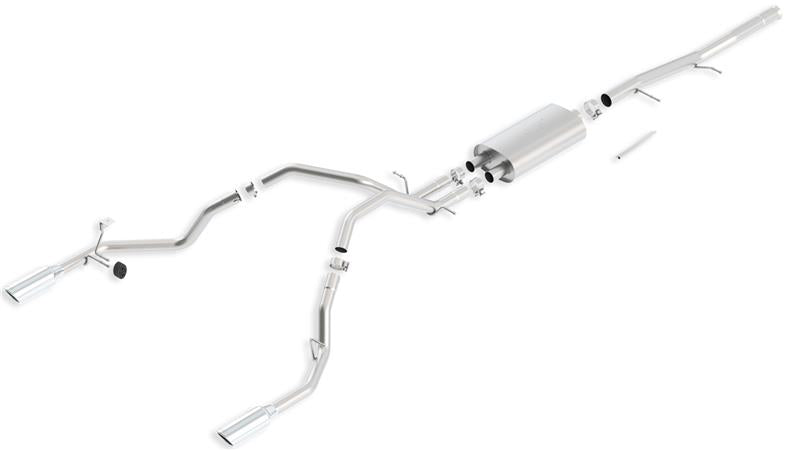This 2.75" diameter into dual 2.25" Cat-Back(tm) system delivers the mellow Touring sound with no drone inside the vehicle. The system features single 4" round bright chrome on T-304 stainless steel tips on each tail pipe. Borla(r) Cat-Back(tm) & Axle-Back exhaust systems feature patented straight-through and multi-core technology designed to unleash hidden horsepower. Increased exhaust velocity adds power, driving excitement, fuel economy, and the distinctive Borla(r) Sound of Power respected by motoring enthusiasts everywhere. Each system is built from premium T-304 stainless steel, superior to T-400 series knockoffs (such as 409), to give you the absolute best in performance and durability. Ultra-smooth mandrel bends ensure maximum flow & power, and precision computer numerical control (CNC) manufacturing ensures an accurate fit. Best of all, Borla(r) stands behind every system with a Million-Mile Warranty. Just what you'd expect from the world's most experienced (and most winning) exhaust brand.