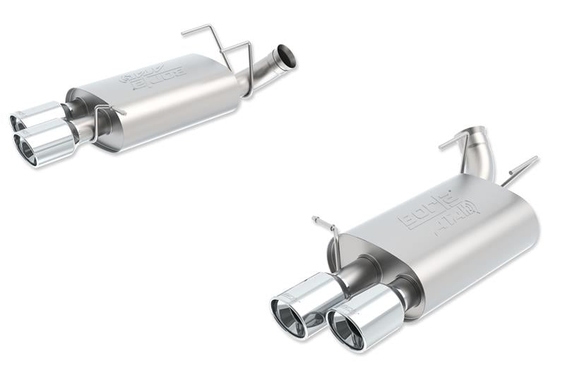 Since mid-1964, Mustang has always been about muscle, looks, and loads of customization options. Borla(r)'s lineup for the Mustang GT and Shelby GT500 lives up to this legacy, with systems to meet a wide variety of performance goals and budgets. For soundaholic Mustang GT drivers who won't settle for anything less than unbridled performance with a pure, aggressive pony car growl, Borla(r) offers a Cat-Back(tm) (PN140318) and Axle-Back (PN11777) system, each featuring Borla(r) S-Type mufflers. Both are also available with Borla(r)'s more sound-absorbing Touring mufflers (PN140319) and (PN11778), for sleeper fans who prefer to be more subtle about their power upgrades. Responding to the high-output exhaust needs of the supercharged 2010 Shelby GT500, Borla(r) engineers developed a specially-tuned Multicore Cat-Back(tm) system (PN140320) which includes an X-Pipe. Borla(r)'s patented high-velocity Multicore design distributes exhaust gases through multiple straight-through perforated cores. A race-tested innovation, Multicore technology is also utilized in Borla(r)'s elite XR-1 mufflers used by winning teams in NHRA, Baja 1000 and many other racing venues, and has been proven to actually outflow a straight pipe. System features high-quality T-304 austenitic stainless steel construction, ultra-smooth mandrel-bent 2.5" tubing, flawless welding from master craftsmen, dual 4" diameter angle-cut rolled edge 12" long bright chrome on T-304 stainless steel tips, and an unrivaled Million-Mile Warranty. From the dimensions and perforation patterns of the inner cores to the amount of composite filament packing, all specifications of Borla(r) mufflers are tuned on a vehicle-by-vehicle basis for an optimum blend of performance and sound. Combined with distinctive motorsport styling, easy bolt-on installation and enhanced fuel economy, the world's most winning exhaust continues to lead the industry it founded over 40 years.