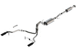 This 3" into dual 2.25" diameter Borla(r) Cat-Back(tm) system was specifically designed to enhance the power and sound of the Ford F-150 equipped with 2.7L and 3.5L engines. The split rear exit configuration replaces the single factory tail pipe, and has single 4" round black chrome on T-304 stainless steel tips on each tail pipe. Using Borla(r) Stainless Steel Polish p# 21461 is NOT recommended with these black chrome tips. We suggest cleaning the tips with hot water and a microfiber cloth. A system with bright chrome on T-304 stainless steel tips is also available. This system features the mellow Touring sound that gives you a mild sound of power with no drone. Additional system are available with different options for sound level, tip finish and tip exits. Add Adapter 60556 for Crew Cab with Standard Bed (6' 7") 157.2" Wheelbase vehicles. Add Adapter 60564 for Extended Cab with Long Bed (8' 2") 164.1" Wheelbase vehicles. Borla(r) Cat-Back(tm) & Axle-Back exhaust systems feature patented straight-through and multi-core technology to unleash hidden horsepower. Increased exhaust velocity adds power, driving excitement, fuel economy, and the distinctive Borla(r) Sound of Power respected by motoring enthusiasts everywhere. Each system is built from premium, high-quality T-304 austenitic stainless steel, superior to T-400 series knockoffs (such as 409), to give you the absolute best in performance and durability. Ultra-smooth mandrel bends ensure maximum flow & power, and precision computer numerical control (CNC) manufacturing ensures an accurate fit. All this is backed by our unsurpassed Million Mile Warranty. System Features: Cat-Back(tm) System Split Rear Exit 4" Round Black Chrome On T-304 Stainless Steel Tips Touring Sound Level T-304 Stainless Steel Construction Bolt-On Installation Million Mile Warranty
