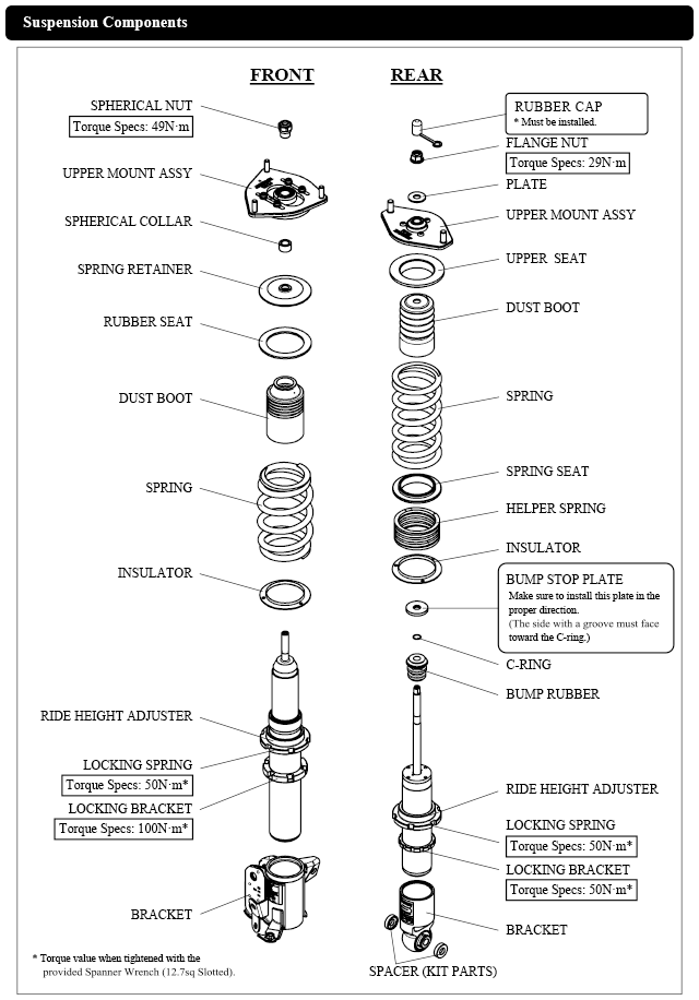 Damper oil leakage or any other problems caused by low ride height setting from the factory setting will void the warranty of the product.)