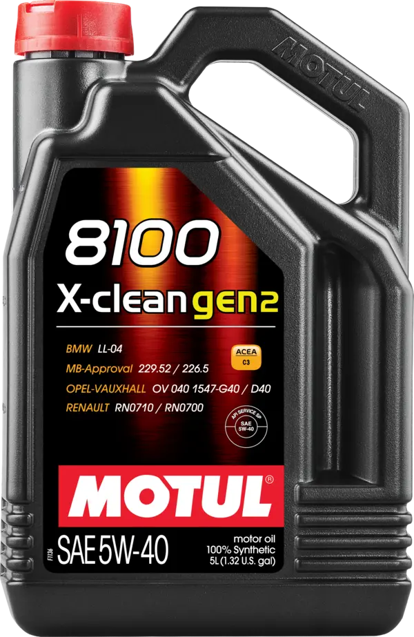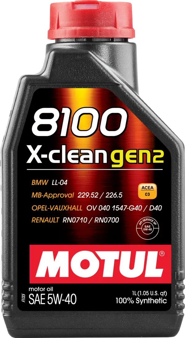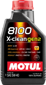 Motul 8100 X-clean Gen2 5W-40 is a high-performance 100% synthetic lubricant approved by multiple major car manufacturers. It’s specially formulated for the latest generation of petrol and diesel engines — naturally aspirated or turbocharged, with direct or indirect injection — that comply with Euro 4, 5, or 6 emission standards.
