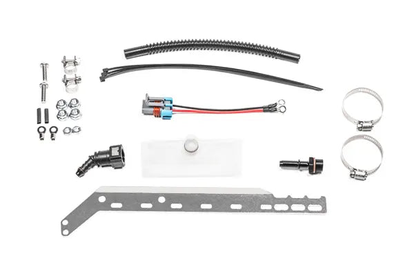 The pump 2 assembly is placed in the tank first followed by the pump 1 assembly. An electrical plug and a SAE quick connector eliminate the need to perform tedious assembly before dropping the entire assembly into the tank. Both fuel pumps merge into the single 8AN ORB outlet of the fuel hat. And because of the integrated check valves, fuel pump staging is permitted.Â