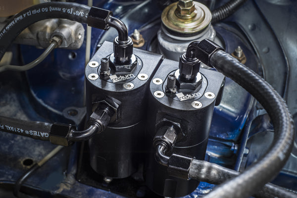 An oil catch can is essential on a performance vehicle to protect the engine from elevated levels of crankcase blow-by accumulated from high performance driving. Excess oil saturated air circulating back into the air intake stream can lead to degraded performance. Radium Engineering catch cans feature large 10AN ORB ports, a 4AN ORB drain port, 2-step oil separation baffling, and an O-ring sealed dipstick.