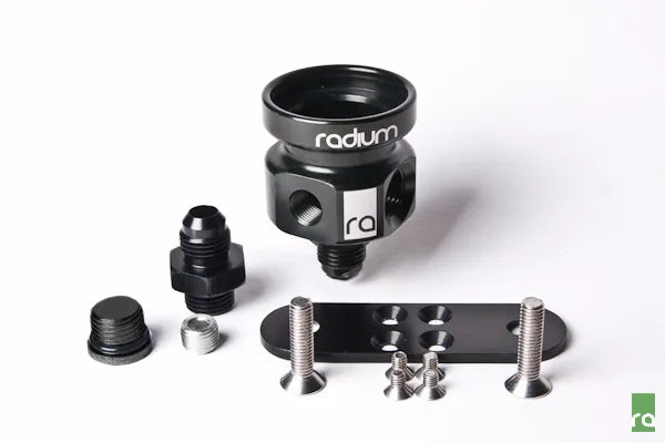The universal Radium Fuel Pressure Regulator (FPR) is built around an OEM Bosch regulator top. These Bosch regulator units are the same found on millions of OEM vehicles from Porsche, Audi and VW to Ford making the quality exceptional. The extremely compact billet aluminum housing provides a convenient package for plumbing and mounting. The regulator body is held in the housing with a stainless steel snap ring and can easily be removed for cleaning or replacement using snap-ring pliers.