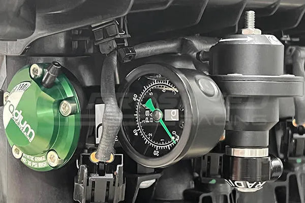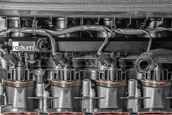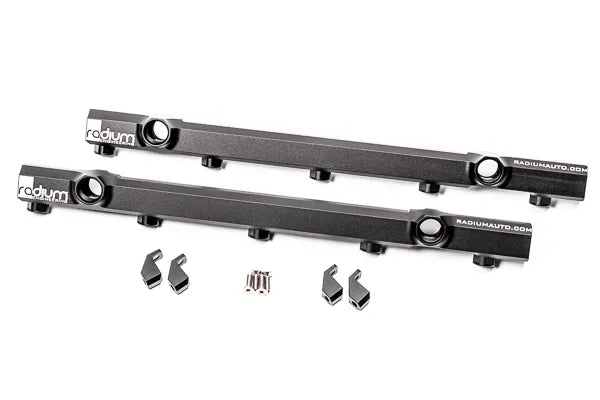 Manufactured with very large .069" internal bores, the fuel rails can support all necessary engine power requirements. They are CNC machined from 6061 aluminum, anodized, and laser etched for a high quality surface finish. Each fuel rail has six 8AN ORB ports (12 in total). Like the OEM fuel rails, the injector bores are 14mm ID so factory injectors, or any equivalent aftermarket injector, can be used. As shown below, the factory injector retaining clips can be reused.