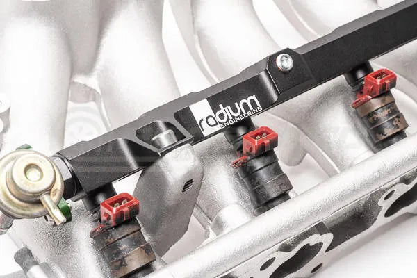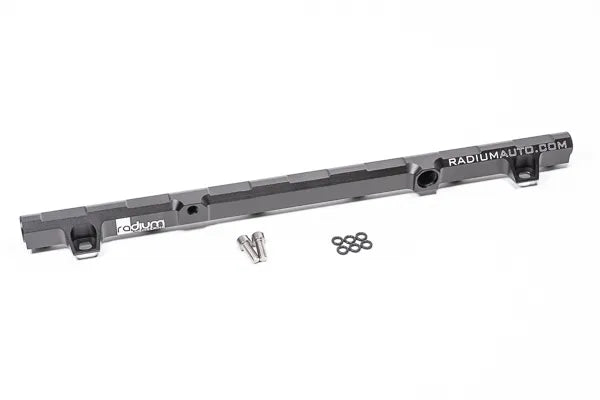 This Nissan RB20DET fuel rail is manufactured with a large 0.69" internal bore, the fuel rail can support all necessary engine power requirements. The rail is CNC machined from a custom 6063 aluminum extrusion and black anodized and laser etched for a high quality surface finish. It incorporates many lightweight features to go with the strong integrated gusset mounts.