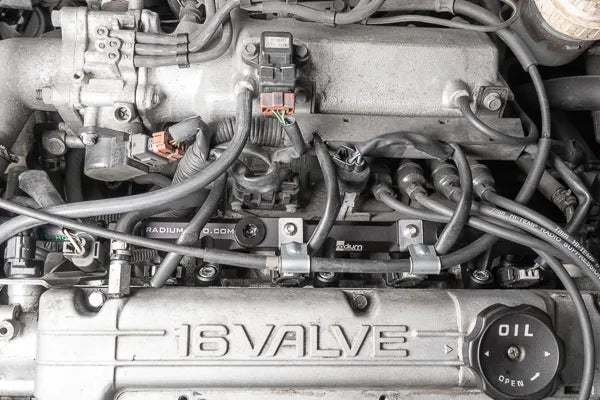The Radium fuel rail eliminates the OEM 2-bolt inlet flange which uses a restrictive 0.22" (5.7mm) orifice. All four ports use -8AN ORB threads.