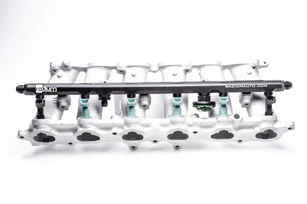 The Radium Engineering fuel rail features 11mm injector bores making it compatible with ALL factory Toyota 2JZ-GE (Non Turbo) fuel injectors. This includes non VVT-i and VVT-i engines as well as air-assist and non air-assist injectors. No modifications are needed. If preparing to use aftermarket fuel injectors, read below.
