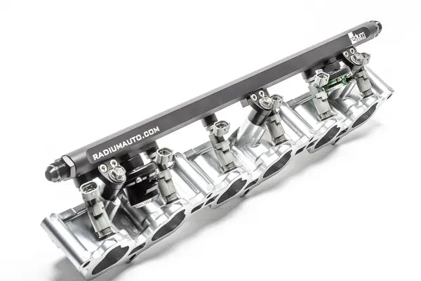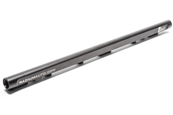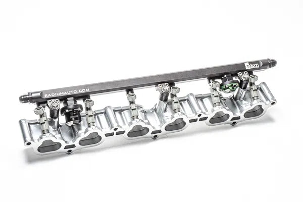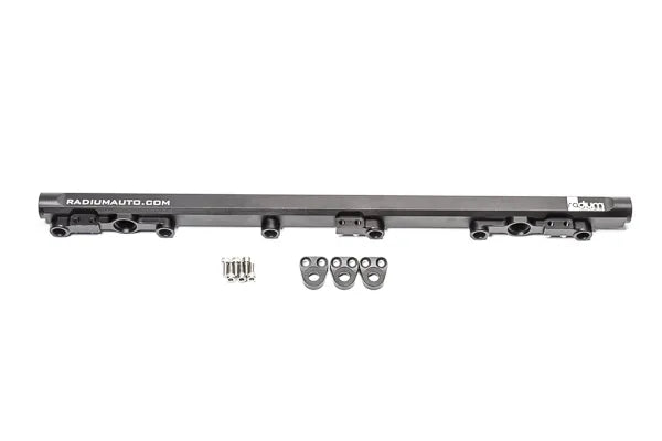 The Radium fuel rail is compatible with the OEM 1JZ-GTE VVT-i top-feed fuel injectors and any aftermarket injectors that fit the OEM fuel rail. Injector bores are 11mm. Lightweight billet aluminum mounting feet are provided for strength. To prevent corrosion, stainless steel hardware is included.
