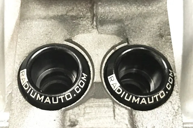 These are the same machined aluminum injector seats used in Radium fuel rails for Mazda/Eunos Cosmo and RX-7 rotary engines. They are required when converting the OEM 16mm injector seat's counterbore to 14mm which is more common with popular injector lower O-rings. They simply "pop" into the OEM injectors bore. They were designed specifically to be compatible with or without the OEM fuel injector diffusers installed. They seal to the machined injector counterbore using the included Viton O-ring.