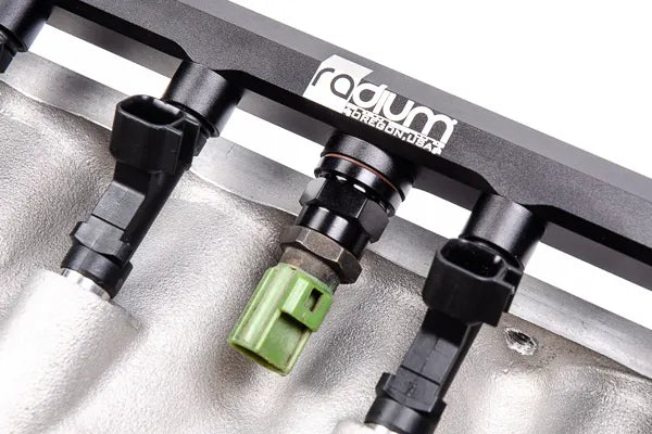 The three 8AN ORB ports are featured on this fuel rail. The extra center port (shown above) allows additional fuel system accessories such as the OEM fuel temperature sensor (shown below using 14-0421), a pressure transducer, Radium fuel pulse damper, etc.