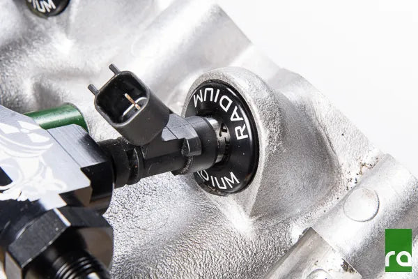 The Radium fuel rail converts the OEM side feed fuel injector setup to top feed allowing the use of high flow 14mm O-ring short (34mm) fuel injectors. Fuel injectors are not included and not sold by Radium Engineering. Reference the diagram below to ensure you are using compatible fuel injectors.